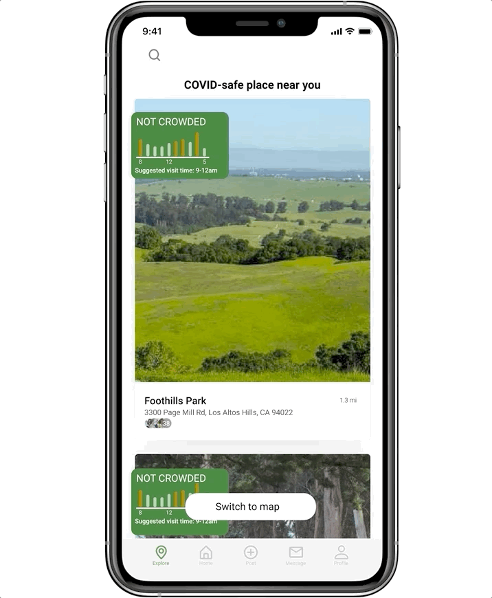To really stand at users’ positions and see if my design works, I conducted five user testing interviews with users who have the need of exploring new and pandemic-friendly places around their neighborhood. I recruited the same group of users from the first round of user interviews. The user testings were all remote through zoom. I asked my users to share their screen and use my Figma prototype link to interact with the app. My goals for these testings are to find out all the problems with app usability as well as to emphasize the purpose and clearly fulfill users’ needs.